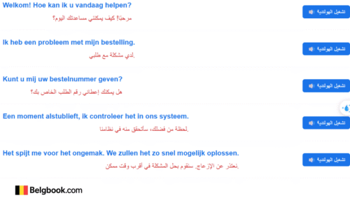 هذا درس تدريبي لمحاكاة مواقف خدمة العملاء بين الهولندية والعربية، مع إمكانية تشغيل الصوت باللهجة الفلامانية.